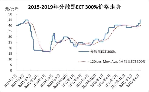 進(jìn)入2019年,國(guó)內(nèi)分散染料市場(chǎng)在經(jīng)歷小幅度回調(diào)后,再度開始上漲模式,截至2019年4月底,分散染料市場(chǎng)價(jià)格再度站上45元/公斤一線(分散黑ECT 300%),于此同時(shí),分散染料市場(chǎng)也徹底收復(fù)了2015年暴跌以來所有跌幅。