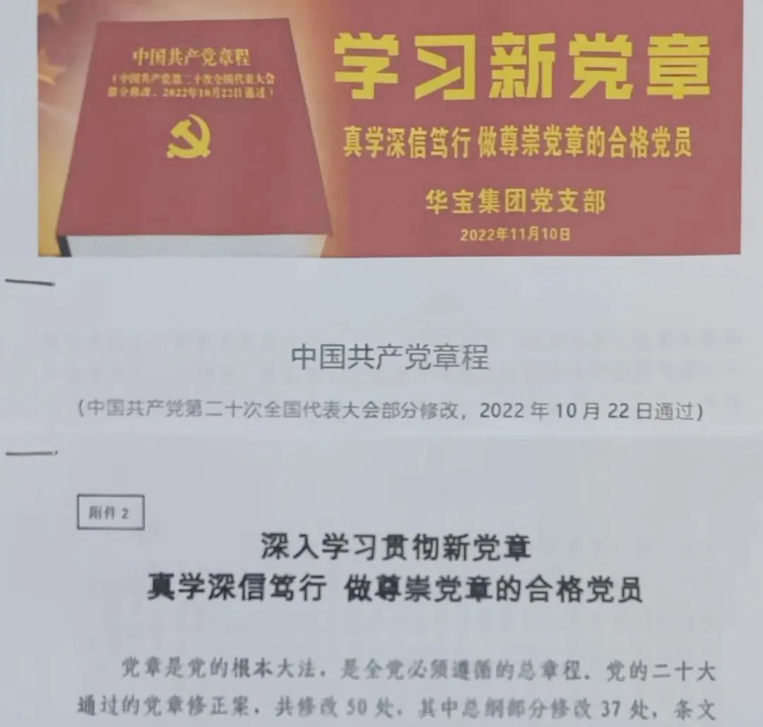 學習新黨章 做尊崇黨章的合格黨員 習近平總書記指出:“黨章是我們立黨、治黨、管黨的總章程,是全黨最基本、最重要、最全面的行為規(guī)范?!秉h的二十大審議通過的《中國共產黨章程(修正案)》,凝聚了全黨的共同意志,切實鞏固了黨的二十大的重大政治成果,為全面建設社會主義現(xiàn)代化國家、全面推進中華民族偉大復興統(tǒng)一了思想、意志和行動。 2022年11月10日,華寶集團黨支部開展了學習新黨章的活動,組織黨員逐字逐句學、原原本本學,把黨章學深學透,特別是針對新修改的內容,不時展開熱烈的討論。通過學習,引導支部黨員嚴格遵守黨章、堅決貫徹黨章,嚴肅維護黨章,做一名合格黨員。